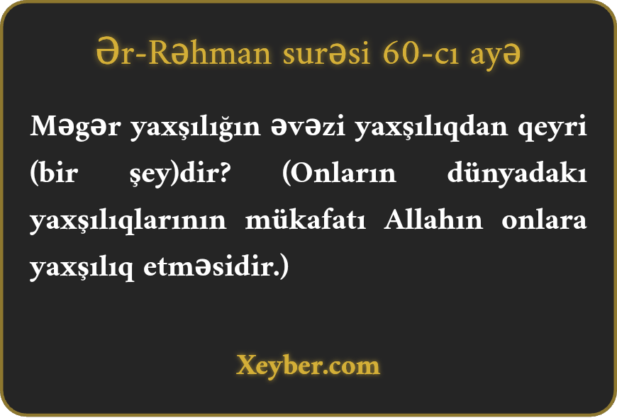 Məgər yaxşılığın əvəzi yaxşılıqdan qeyri (bir şey)dir? (Onların dünyadakı yaxşılıqlarının mükafatı Allahın onlara yaxşılıq etməsidir.)