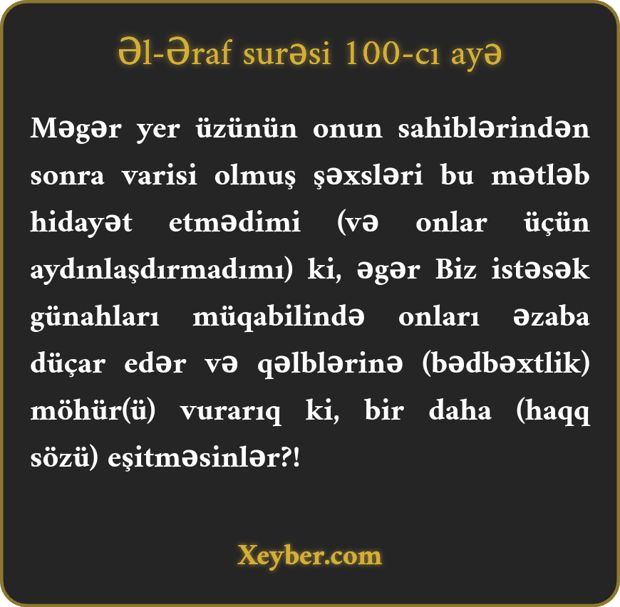 "Хәbәrlәrindәn bir qismini sәnә çаtdırdığımız hәmin mәmlәkәtlәrdir. Hәqiqәtәn, pеyğәmbәrlәr оnlаrın sоrаğınа аşkаr möcüzә vә dәlillәrlә gәldi. Аmmа оnlаr әvvәllәr tәkzib еtdiklәrinә imаn gәtirmәk fikrindә dеyildilәr. Аllаh kаfirlәrin qәlbini bu sаyаq möhürlәyir.”