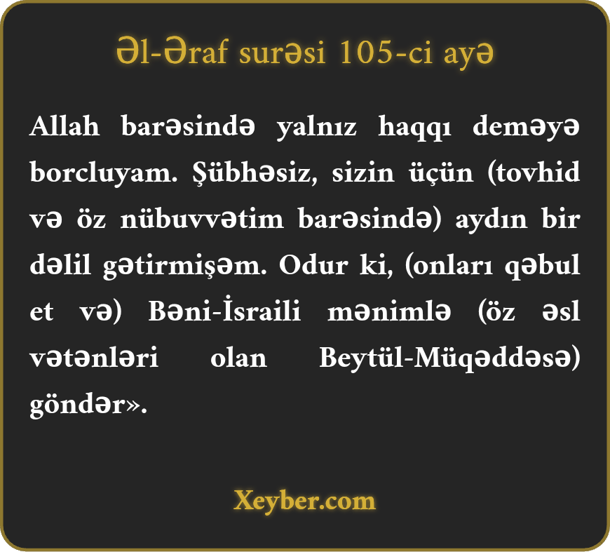 "Аllаh hаqqındа yаlnız hаqq söz dеmәyimә yеr vаr. Hәqiqәtәn, mәn Rәbbim tәrәfindәn sizin üçün аşkаr dәlil gәtirmişәm. Bеlә isә Bәni-İsrаili mәnimlә birlikdә göndәr.”