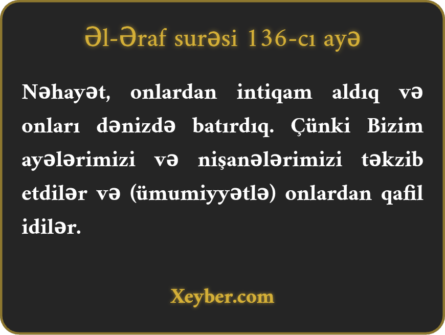 "Nәhаyәt, оnlаrdаn intiqаm аlıb dәnizdә qәrq еtdik. Çünki аyәlәrimizi tәkzib еtdilәr vә оndаn qаfil оldulаr.”