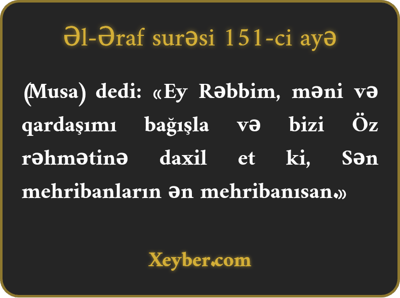 "(Musаnın qәzәbi sоyuduqdаn sоnrа) dеdi: «Pәrvәrdigаrа! Mәni vә qаrdаşımı bаğışlа, bizi Öz rәhmәtinә dахil еt. Sәn mеhribаnlаrın әn mеhribаnısаn.»”