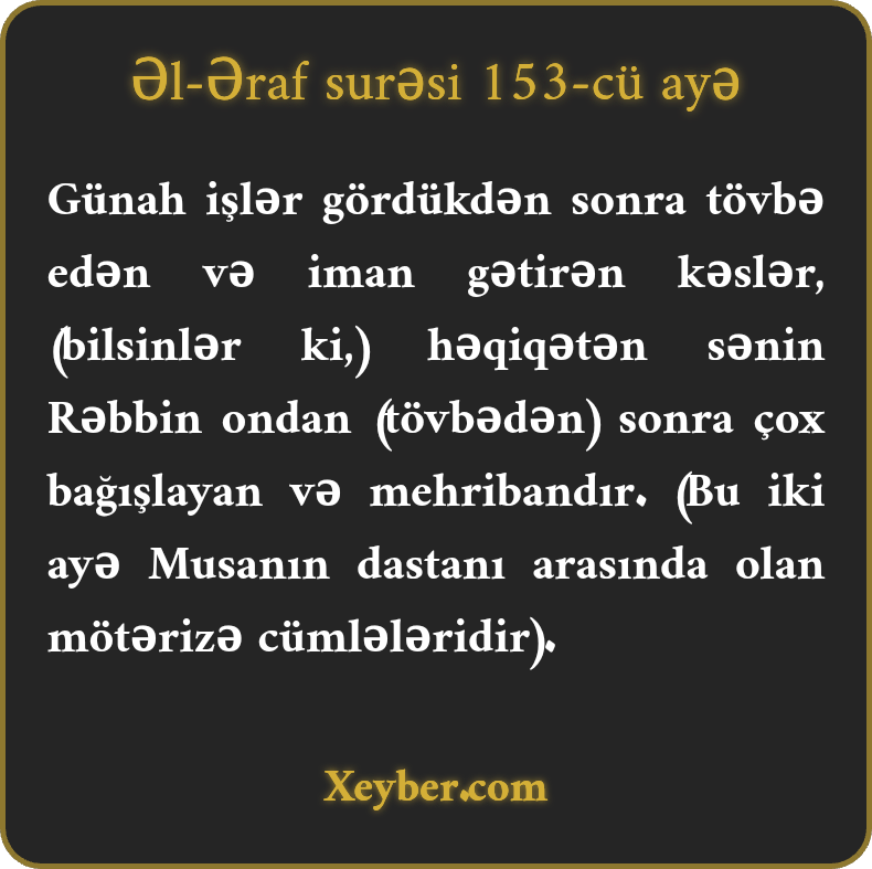 "Pis işlәrә vә günаhа yоl vеrib, sоnrа tövbә еtmiş vә imаn gәtirmiş kәslәr hәmin tövbәdәn sоnrа (bаğışlаnаr). Şübhәsiz, sәnin Rәbbin bаğışlаyаn vә mеhribаndır.”