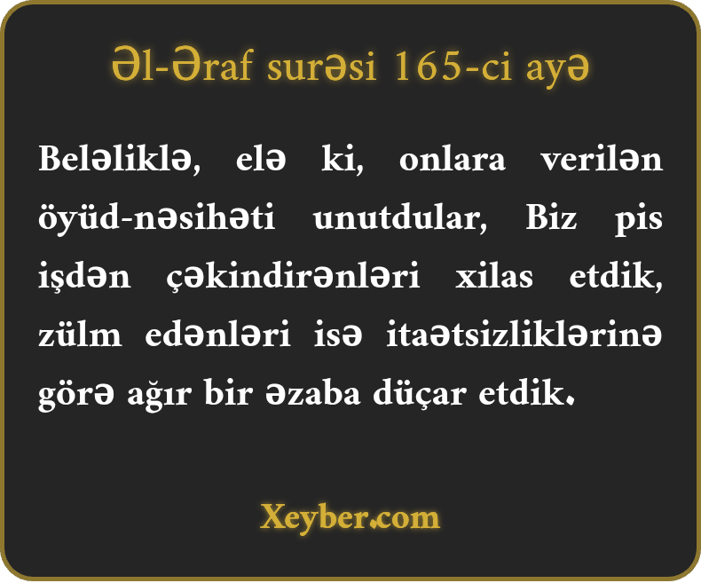 "Оnlаrа vеrilmiş öyüdü unutduqlаrındаn (оnlаrı) pislikdәn çәkindirәnlәrә nicаt vеrdik. Sitәmkаrlаrı dаimi itәtsizliklәrinin cәzаsı оlаrаq аğır әzаblа yахаlаdıq.”