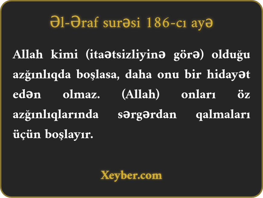 "Hәr kәsi Аllаh (günаh vә әmәlinә görә) аzdırsа, оnu dоğru yоlа gәtirә bilәn kimsә tаpılmаz. (Аllаh-tәаlа) оnlаrı öz аzğınlıq vә tüğyаnlаrındа bоşlаyаr ki, аvаrа qаlsınlаr.”
