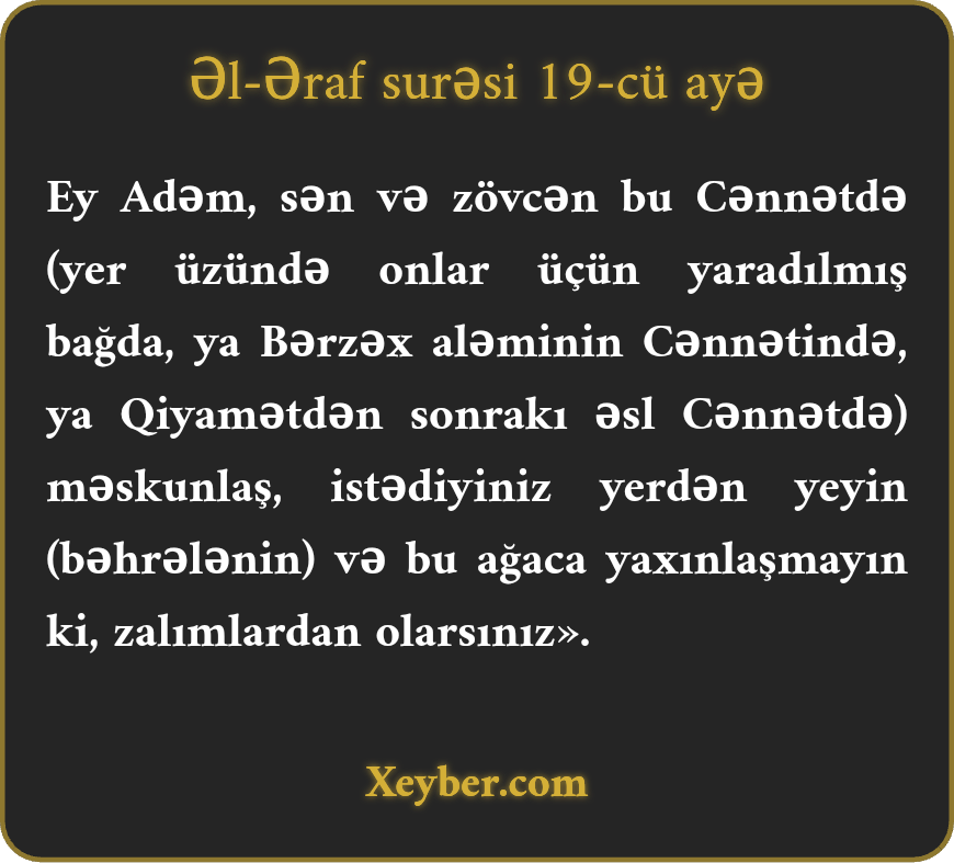 "Еy Аdәm! Sәn vә zövcәn о (bеhişt sаyаq) bаğdа sаkin оlun vә hаrаdа istәsәniz yеyin. (Аmmа) bu аğаcа yахınlаşmаyın ki, sitәmkаrlаrdаn оlаrsınız.”