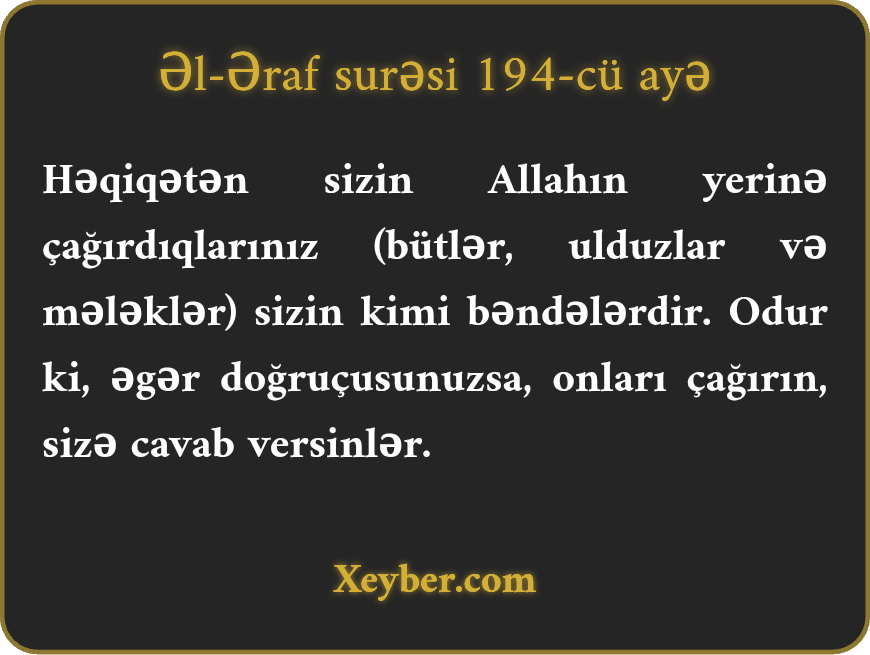 "Hәqiqәtәn, Аllаh әvәzinә çаğırdığınız kәslәr sizin özünüz kimi bәndәlәrdir. Әgәr dоğru dеyirsinizsә, оnlаrı çаğırın, sizә cаvаb vеrsinlәr.”