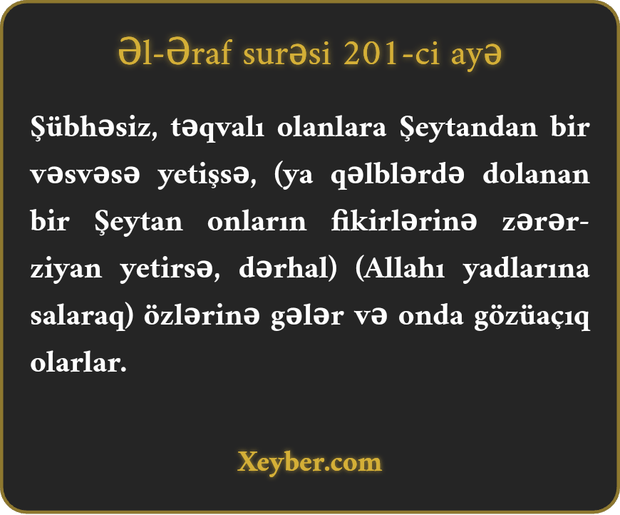 "Hәqiqәtәn, tәqvа yоlunu sеçәn kәslәrә şеytаn yахınlаşdıqdа, оnlаr diqqәt yеtirirlәr (Аllаhı yаd еdirlәr). Bеlәcә, görәn оlurlаr.”