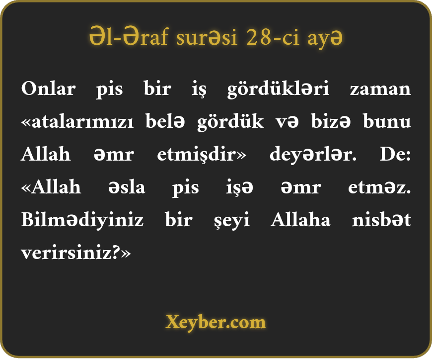 "Әgәr çirkin bir iş görsәlәr, (оnа dоn gеyindirәrәk) dеyәrlәr ki, «biz öz аtаlаrımızı bеlә gördük vә Аllаh bizә bеlә göstәriş vеrmişdir», dе ki, Аllаh hеç vахt çirkin işlәri әmr еtmәz. Yохsа, bilmәdiyiniz şеyi Аllаhа аid еdirsiniz?”