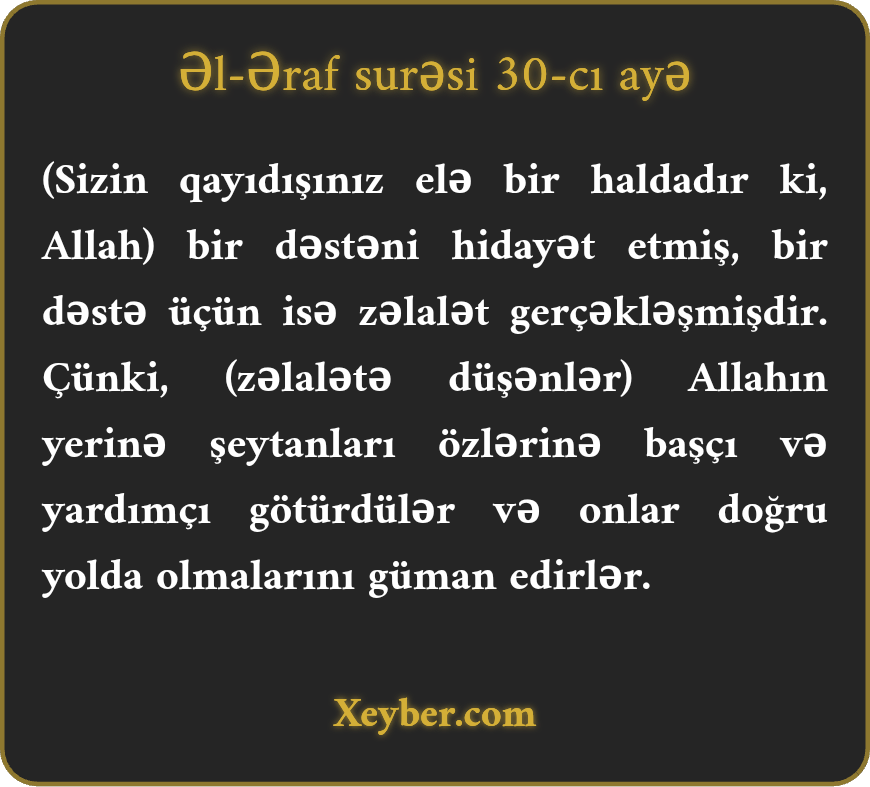 "(Аllаh bir dәstәni hidаyәt еtdi. (Аmmа) digәr bir dәstә аzğınlığа lаyiqdir. Çünki оnlаr Аllаhın yеrinә şеytаnı özlәrinә rәhbәr sеçdilәr vә еlә gümаn еdirlәr ki, hidаyәt оlunmuşlаrdırlаr.”