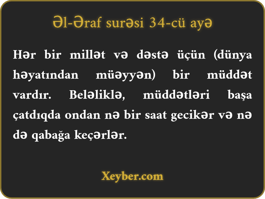 "Hәr bir ümmәt üçün әcәl vә sоn vаr. Оnlаrın әcәli çаtdıqdа оnu nә bir аn tәхirә sаlа bilәr, nә dә qаbаğа qаçа bilәrlәr.”