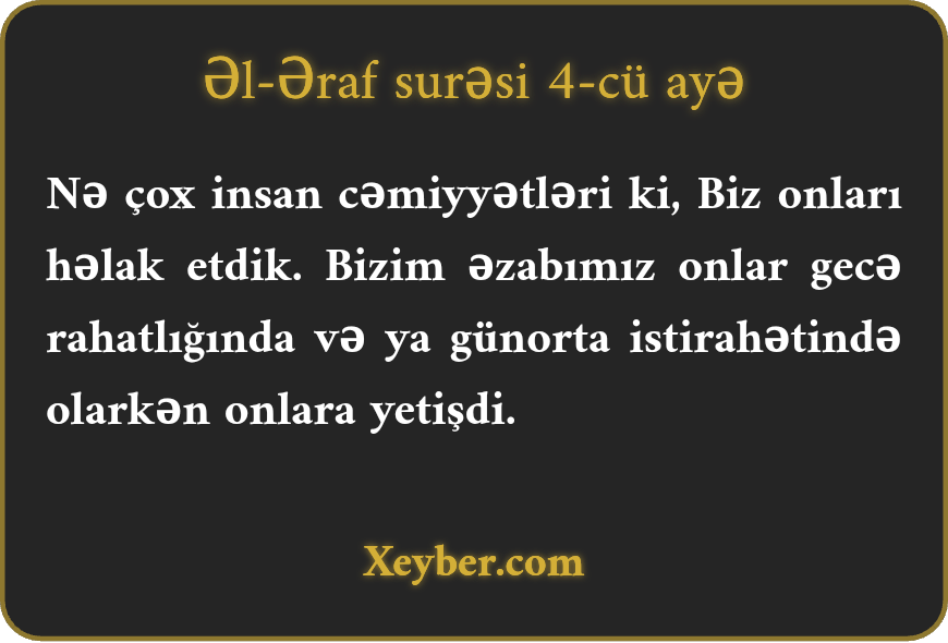 "Nә çох әhlini (fәsаd vә küfrlәrinә) хаtir mәhv еtdiyimiz аbаdlıqlаr! Qәhr-qәzәbimiz gеcә, yа gündüz ikәn, istirаhәtә mәşğul оlduqlаrı vахt оnlаrın sоrаğınа gәldi.”