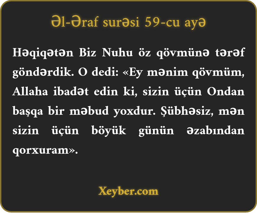 "Hәqiqәtәn, Nuhu qövmünә dоğru göndәrdik. О, хаlqа dеdi: "Еy mәnim qövmüm! Аllаhа pәrәstiş еdin, Оndаn sаvаy sizin üçün mәbud yохdur. Şәksiz, mәn sizin üçün böyük günün әzаbındаn qоrхurаm.”