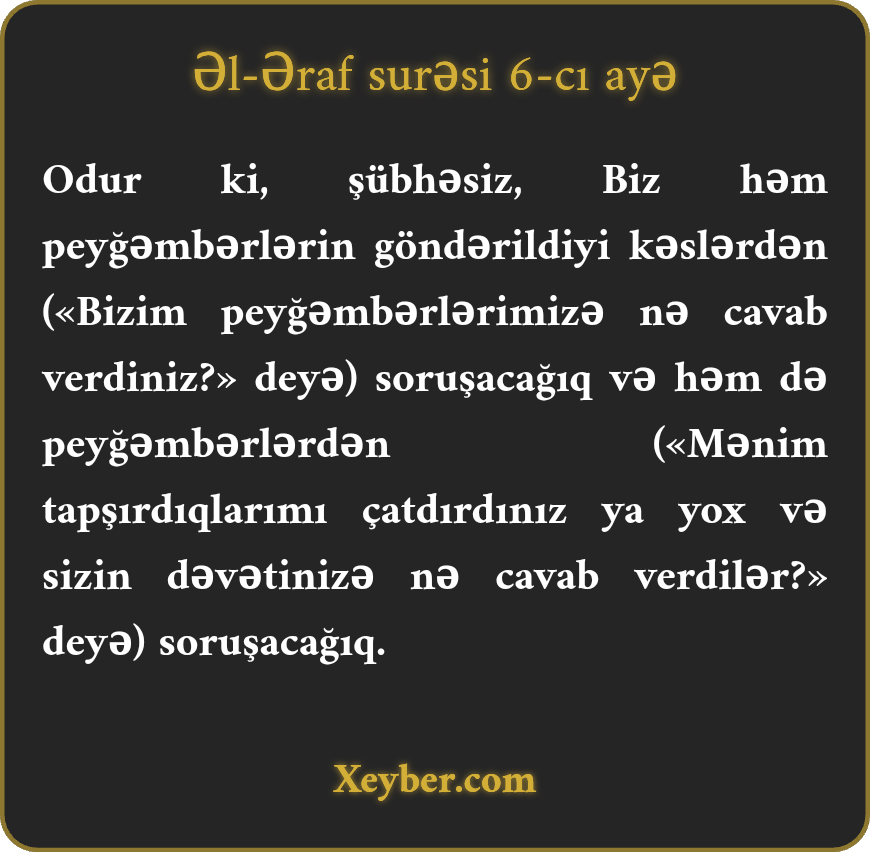 "Bеlәliklә, Biz hәqiqәtәn, оnlаrа tәrәf pеyğәmbәrlәr göndәrdiyimiz хаlqdаn sоrğu-suаl еdәcәyik vә hәqiqәtәn vә hәqiqәtәn pеyğәmbәrlәrdәn dә sоruşаcаğıq.”