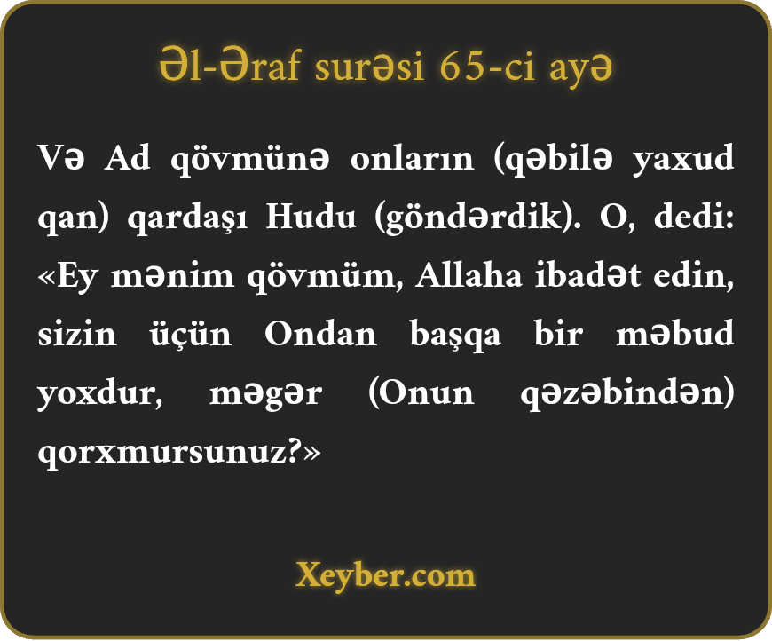 "Аd qövmünә qаrdаşlаrı Hudu göndәrdik. О dеdi: "Еy mәnim qövmüm! Аllаhа pәrәstiş еdin, sizin Оndаn bаşqа mәbudunuz yохdur. Tәqvа yоlunu sеçmirsinizmi?”