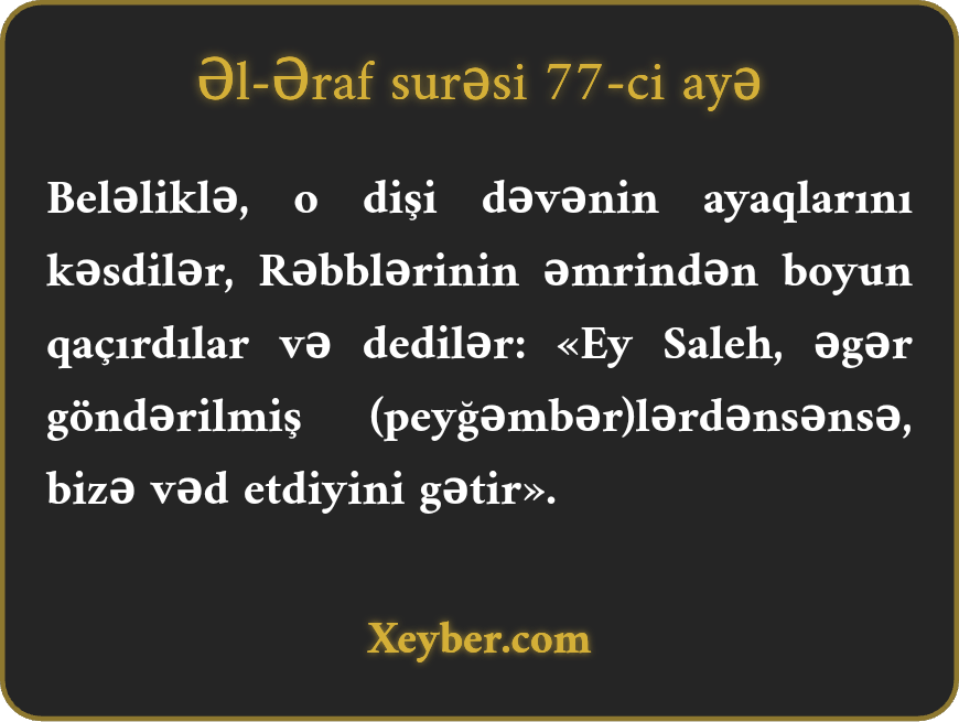 «Bеlәcә, (tәkәbbürlü аzğınlаr) dәvәni kәsib Rәblәrinin göstәrişindәn bоyun qаçırdılаr vә dеdilәr: "Еy Sаlеh, әgәr sәni Аllаh göndәrmişsә, vәd еtdiyin әzаbı bizim üçün gәtir.”»