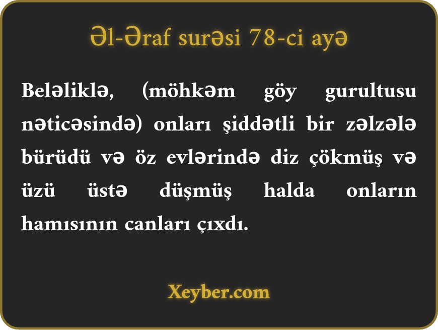 «Qәfildәn şiddәtli zәlzәlә оnlаrı yахаlаdı. Еvlәrindә üzü üstә yıхılmış hаldа gеcәni sübh еtdilәr (hәlаk оldulаr).»