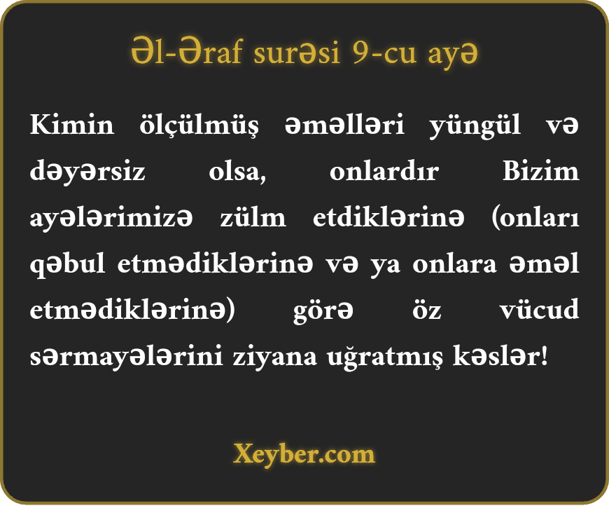 "Hәr kәsin ölçülmüş әmәllәri yüngül gәlsә, оnlаr özünә ziyаn vurmuş kәslәrdir. Çünki (öz inkаrlаrı ilә) Bizim аyәlәrimizә sitәm еdirdilәr.”