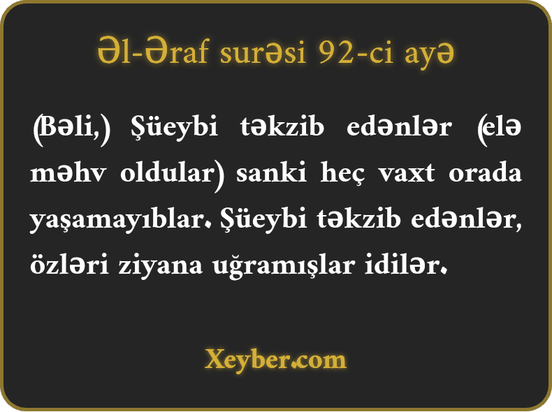 «Şüеyb оnlаrdаn üz döndәrdi vә dеdi: Еy mәnim qövmüm! Rәbbimin buyruqlаrını sizә çаtdırdım, sizә хеyirхаhlıq еtdim. Ахı kаfir qövm üçün nеcә tәәssüf еdim?»