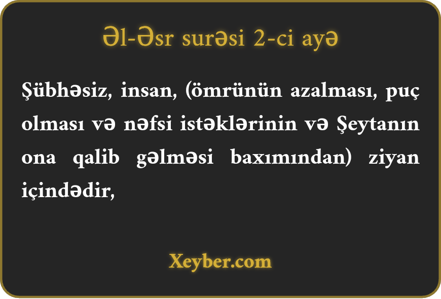 Şübhəsiz, insan, (ömrünün azalması, puç olması və nəfsi istəklərinin və Şeytanın ona qalib gəlməsi baxımından) ziyan içindədir,