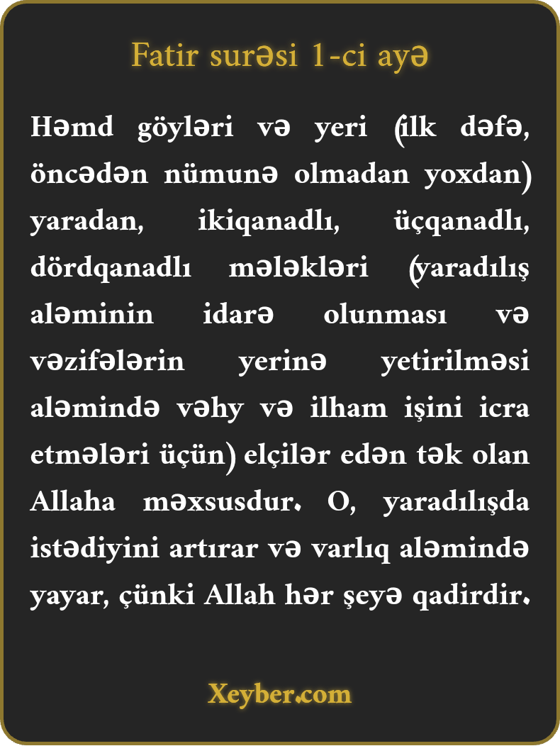 Həmd göyləri və yeri (ilk dəfə, öncədən nümunə olmadan yoxdan) yaradan, ikiqanadlı, üçqanadlı, dördqanadlı mələkləri (yaradılış aləminin idarə olunması və vəzifələrin yerinə yetirilməsi aləmində vəhy və ilham işini icra etmələri üçün) elçilər edən tək olan Allaha məxsusdur. O, yaradılışda istədiyini artırar və varlıq aləmində yayar, çünki Allah hər şeyə qadirdir.