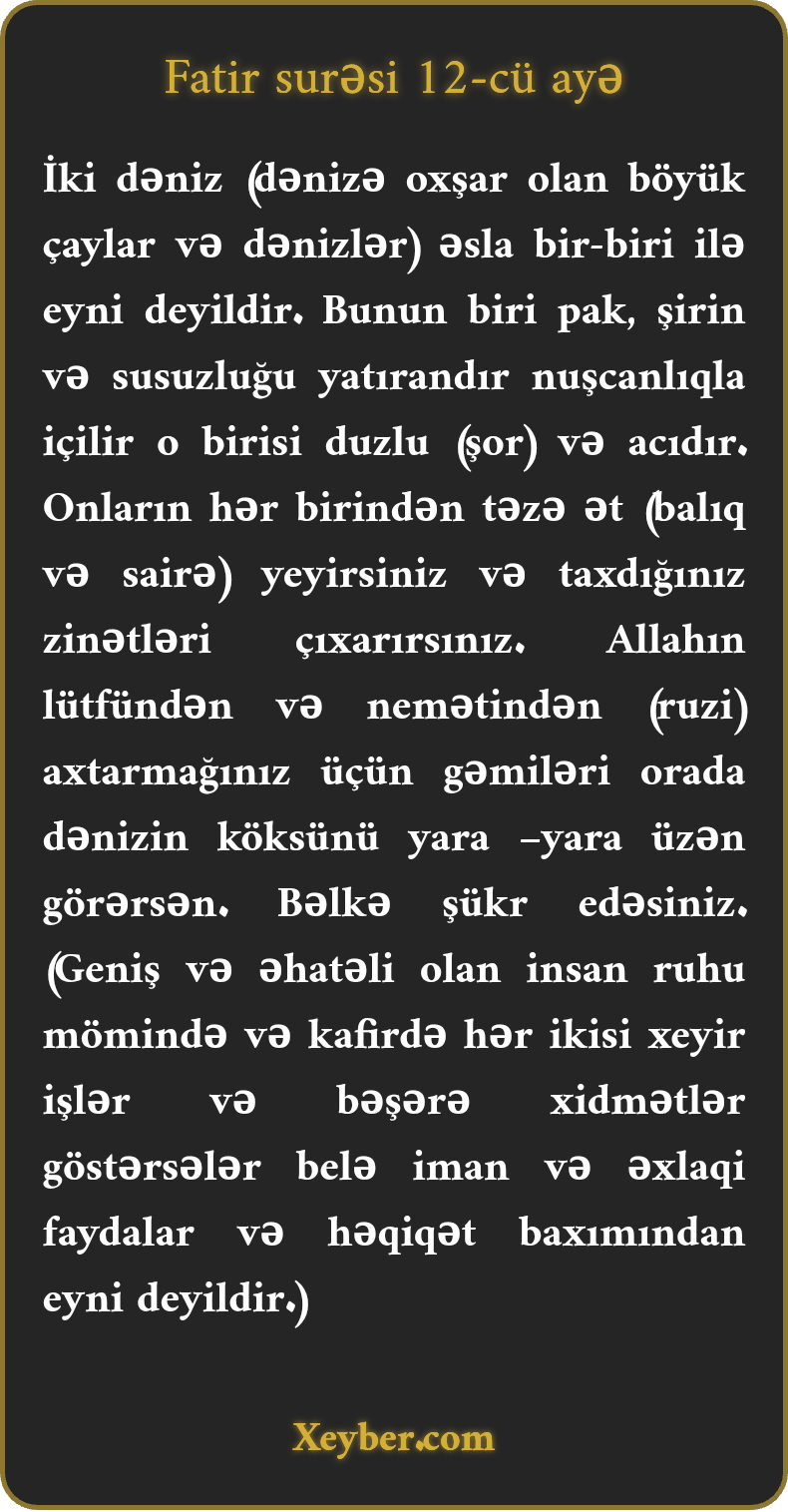 İki dəniz (dənizə oxşar olan böyük çaylar və dənizlər) əsla bir-biri ilə eyni deyildir. Bunun biri pak, şirin və susuzluğu yatırandır nuşcanlıqla içilir o birisi duzlu (şor) və acıdır. Onların hər birindən təzə ət (balıq və sairə) yeyirsiniz və taxdığınız zinətləri çıxarırsınız. Allahın lütfündən və nemətindən (ruzi) axtarmağınız üçün gəmiləri orada dənizin köksünü yara –yara üzən görərsən. Bəlkə şükr edəsiniz. (Geniş və əhatəli olan insan ruhu mömində və kafirdə hər ikisi xeyir işlər və bəşərə xidmətlər göstərsələr belə iman və əxlaqi faydalar və həqiqət baxımından eyni deyildir.)