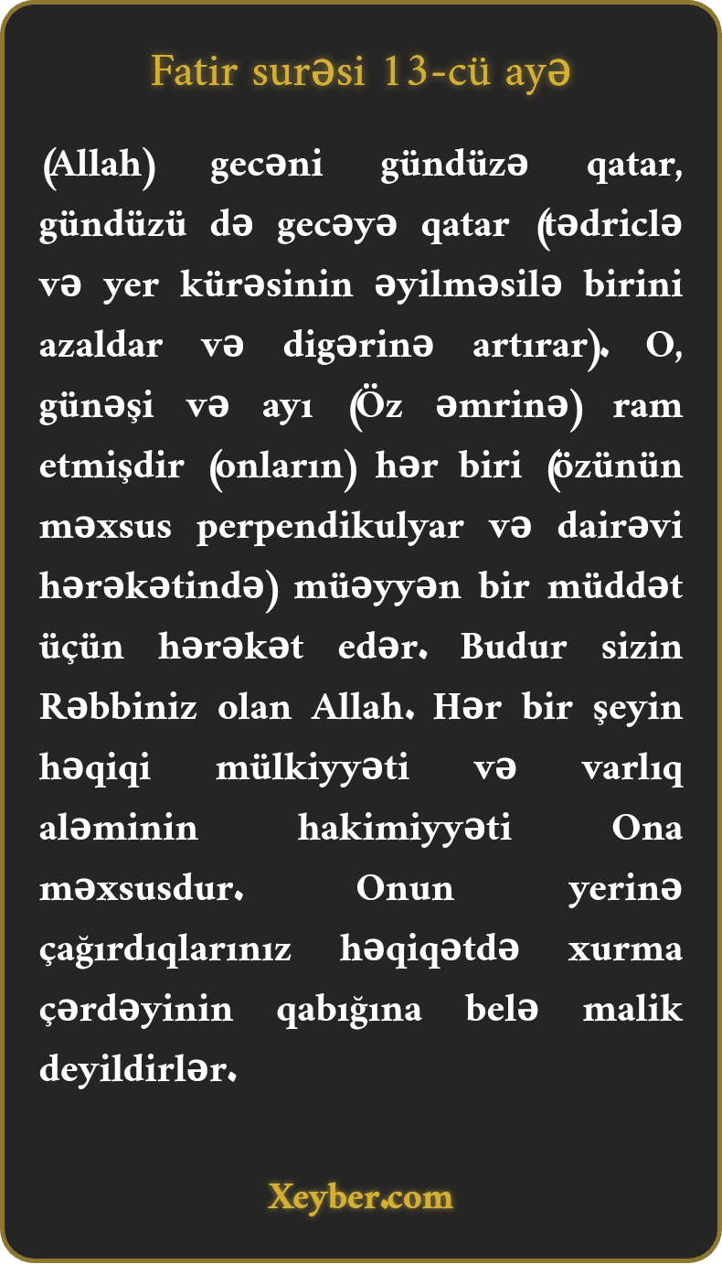 (Allah) gecəni gündüzə qatar, gündüzü də gecəyə qatar (tədriclə və yer kürəsinin əyilməsilə birini azaldar və digərinə artırar). O, günəşi və ayı (Öz əmrinə) ram etmişdir (onların) hər biri (özünün məxsus perpendikulyar və dairəvi hərəkətində) müəyyən bir müddət üçün hərəkət edər. Budur sizin Rəbbiniz olan Allah. Hər bir şeyin həqiqi mülkiyyəti və varlıq aləminin hakimiyyəti Ona məxsusdur. Onun yerinə çağırdıqlarınız həqiqətdə xurma çərdəyinin qabığına belə malik deyildirlər.