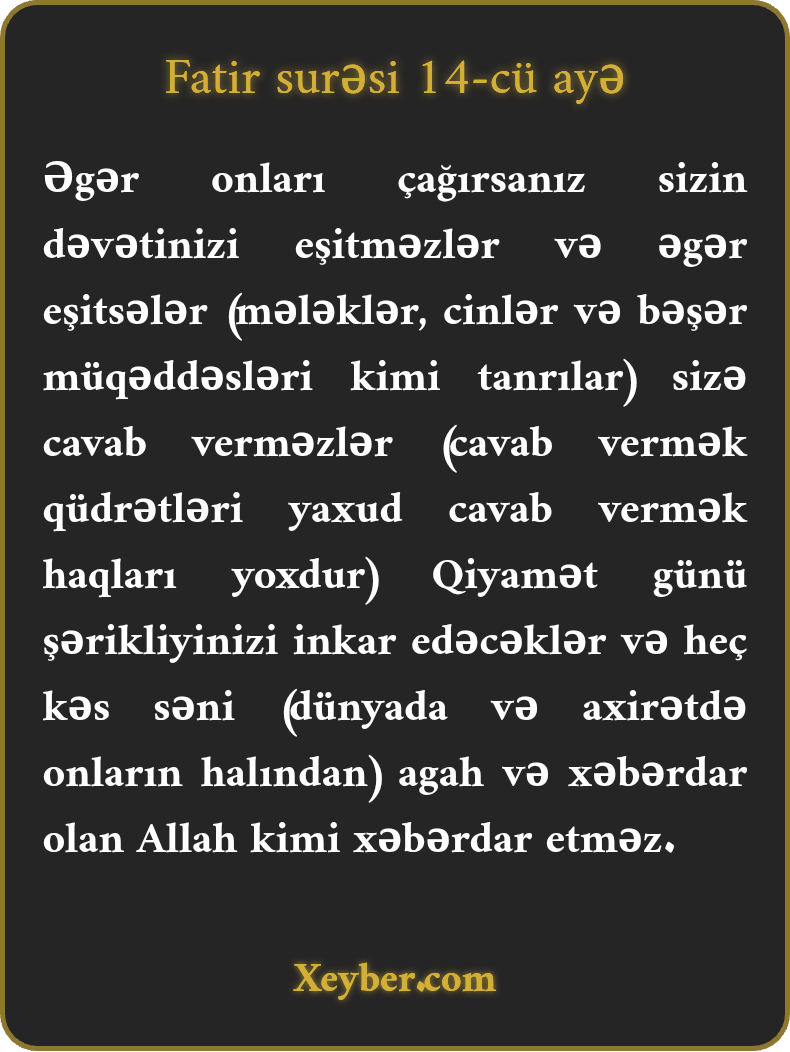 Əgər onları çağırsanız sizin dəvətinizi eşitməzlər və əgər eşitsələr (mələklər, cinlər və bəşər müqəddəsləri kimi tanrılar) sizə cavab verməzlər (cavab vermək qüdrətləri yaxud cavab vermək haqları yoxdur) Qiyamət günü şərikliyinizi inkar edəcəklər və heç kəs səni (dünyada və axirətdə onların halından) agah və xəbərdar olan Allah kimi xəbərdar etməz.