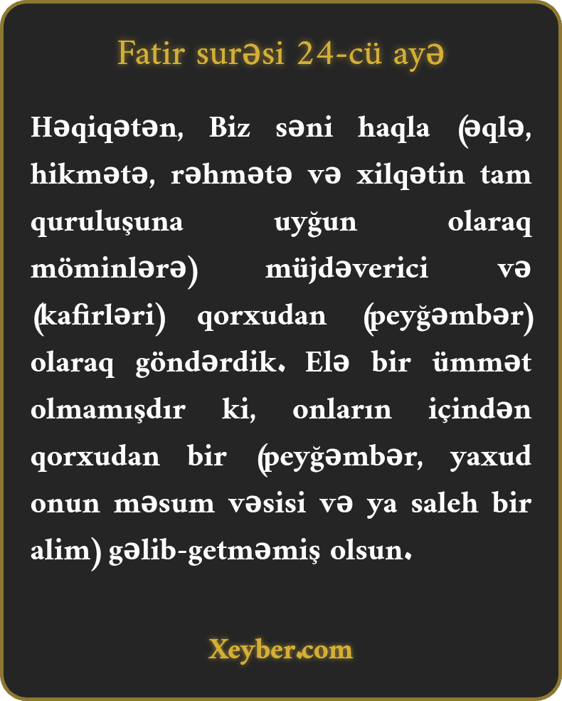 Həqiqətən, Biz səni haqla (əqlə, hikmətə, rəhmətə və xilqətin tam quruluşuna uyğun olaraq möminlərə) müjdəverici və (kafirləri) qorxudan (peyğəmbər) olaraq göndərdik. Elə bir ümmət olmamışdır ki, onların içindən qorxudan bir (peyğəmbər, yaxud onun məsum vəsisi və ya saleh bir alim) gəlib-getməmiş olsun.