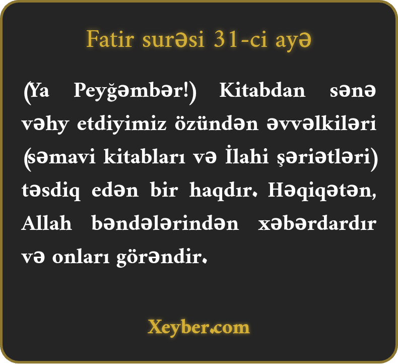 (Ya Peyğəmbər!) Kitabdan sənə vəhy etdiyimiz özündən əvvəlkiləri (səmavi kitabları və İlahi şəriətləri) təsdiq edən bir haqdır. Həqiqətən, Allah bəndələrindən xəbərdardır və onları görəndir.
