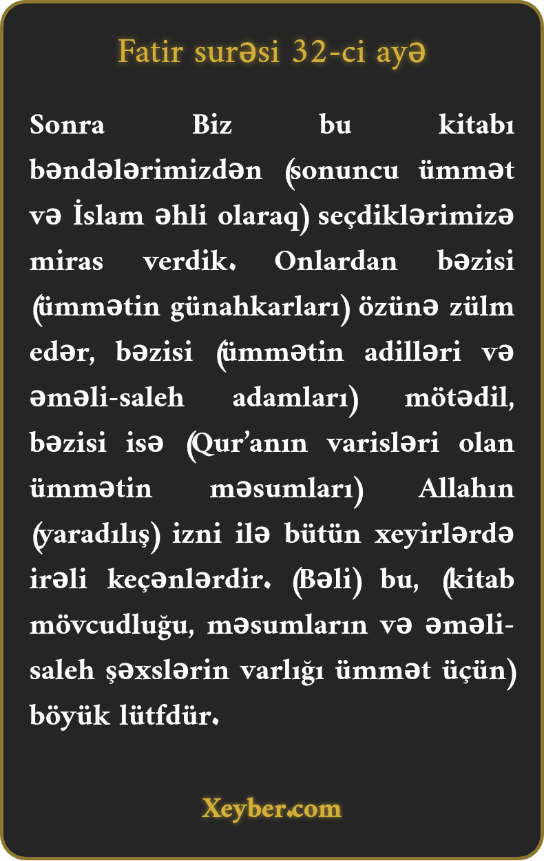 Sonra Biz bu kitabı bəndələrimizdən (sonuncu ümmət və İslam əhli olaraq) seçdiklərimizə miras verdik. Onlardan bəzisi (ümmətin günahkarları) özünə zülm edər, bəzisi (ümmətin adilləri və əməli-saleh adamları) mötədil, bəzisi isə (Qur’anın varisləri olan ümmətin məsumları) Allahın (yaradılış) izni ilə bütün xeyirlərdə irəli keçənlərdir. (Bəli) bu, (kitab mövcudluğu, məsumların və əməli-saleh şəxslərin varlığı ümmət üçün) böyük lütfdür.