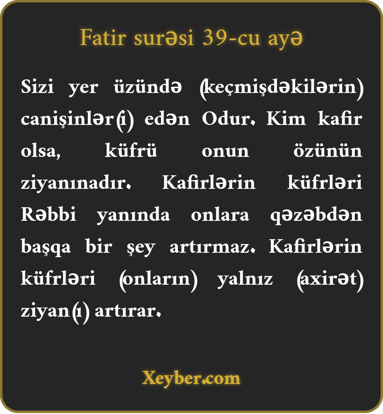 Sizi yer üzündə (keçmişdəkilərin) canişinlər(i) edən Odur. Kim kafir olsa, küfrü onun özünün ziyanınadır. Kafirlərin küfrləri Rəbbi yanında onlara qəzəbdən başqa bir şey artırmaz. Kafirlərin küfrləri (onların) yalnız (axirət) ziyan(ı) artırar.