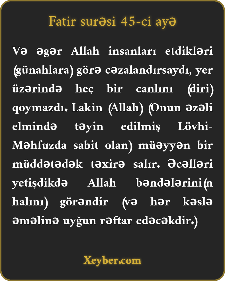Və əgər Allah insanları etdikləri (günahlara) görə cəzalandırsaydı, yer üzərində heç bir canlını (diri) qoymazdı. Lakin (Allah) (Onun əzəli elmində təyin edilmiş Lövhi-Məhfuzda sabit olan) müəyyən bir müddətədək təxirə salır. Əcəlləri yetişdikdə Allah bəndələrini(n halını) görəndir (və hər kəslə əməlinə uyğun rəftar edəcəkdir.)