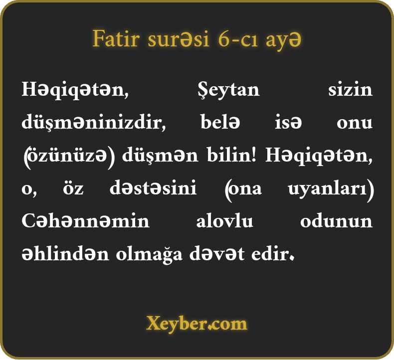 Həqiqətən, Şeytan sizin düşməninizdir, belə isə onu (özünüzə) düşmən bilin! Həqiqətən, o, öz dəstəsini (ona uyanları) Cəhənnəmin alovlu odunun əhlindən olmağa dəvət edir.