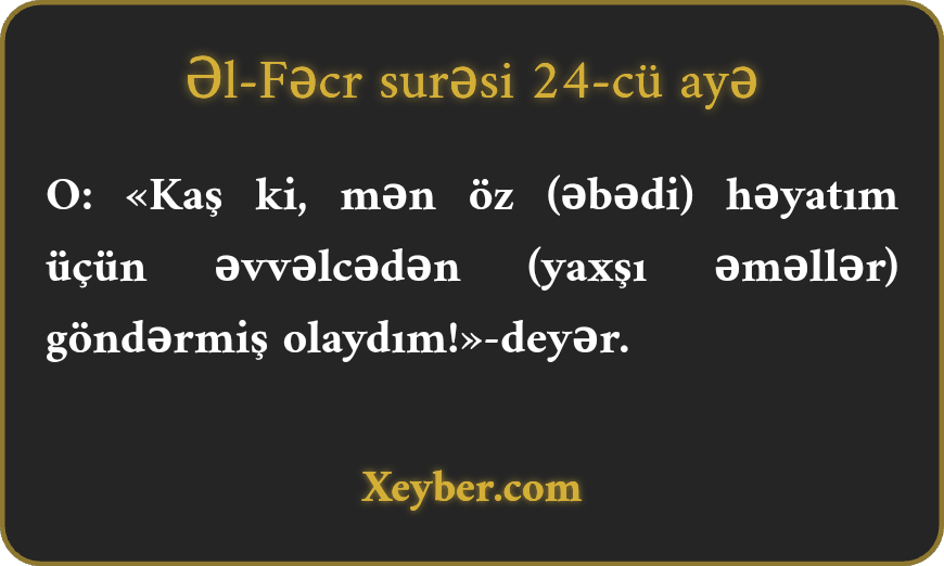 O: «Kaş ki, mən öz (əbədi) həyatım üçün əvvəlcədən (yaxşı əməllər) göndərmiş olaydım!»-deyər.