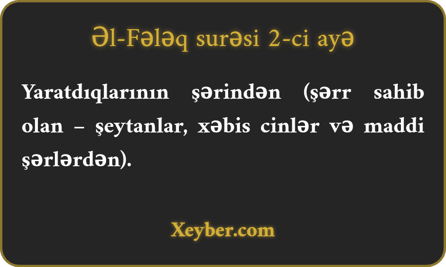 Yaratdıqlarının şərindən (şərr sahib olan – şeytanlar, xəbis cinlər və maddi şərlərdən).