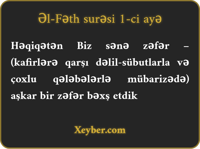 Həqiqətən Biz sənə zəfər – (kafirlərə qarşı dəlil-sübutlarla və çoxlu qələbələrlə mübarizədə) aşkar bir zəfər bəxş etdik