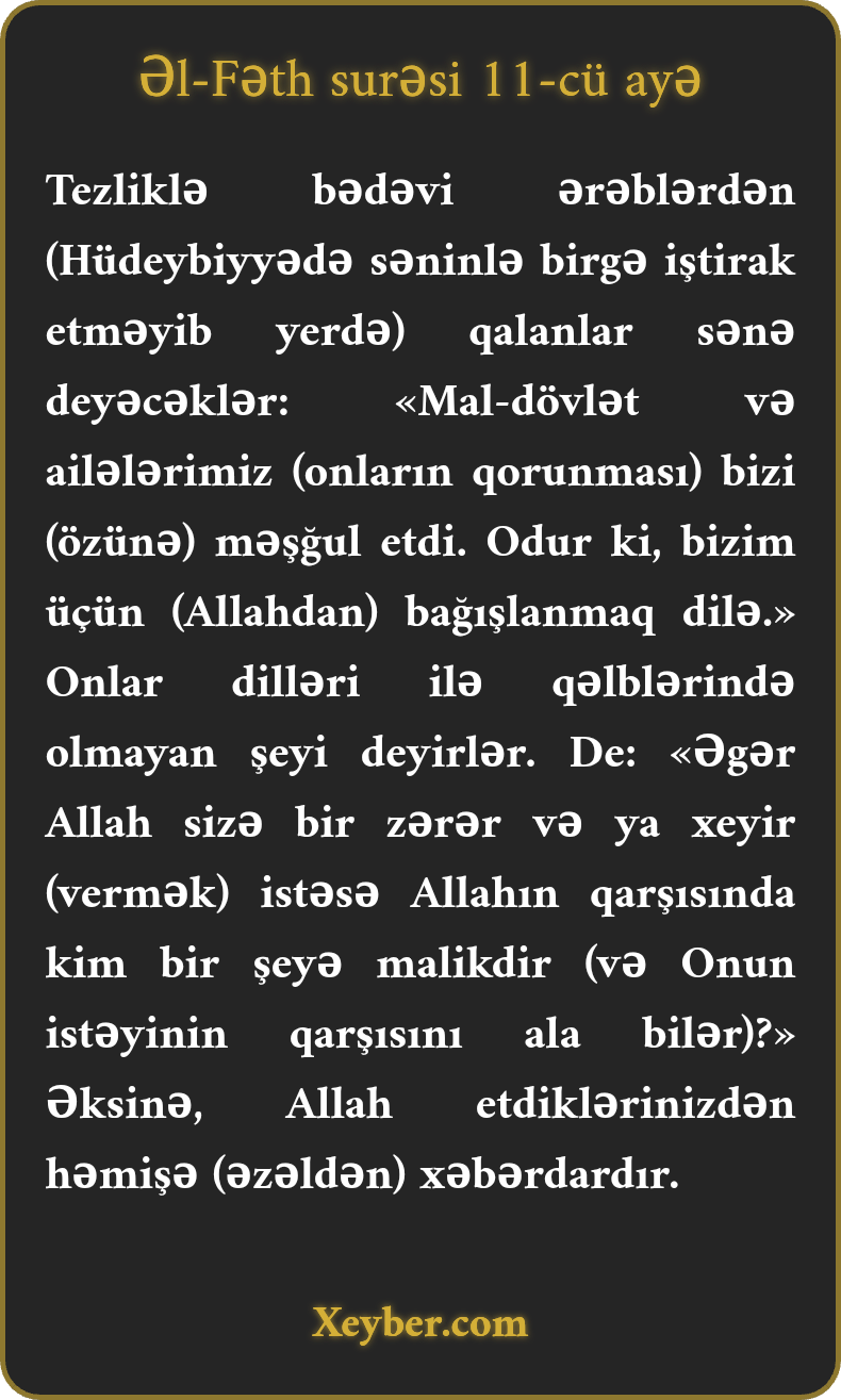 Tezliklə bədəvi ərəblərdən (Hüdeybiyyədə səninlə birgə iştirak etməyib yerdə) qalanlar sənə deyəcəklər: «Mal-dövlət və ailələrimiz (onların qorunması) bizi (özünə) məşğul etdi. Odur ki, bizim üçün (Allahdan) bağışlanmaq dilə.» Onlar dilləri ilə qəlblərində olmayan şeyi deyirlər. De: «Əgər Allah sizə bir zərər və ya xeyir (vermək) istəsə Allahın qarşısında kim bir şeyə malikdir (və Onun istəyinin qarşısını ala bilər)?» Əksinə, Allah etdiklərinizdən həmişə (əzəldən) xəbərdardır.