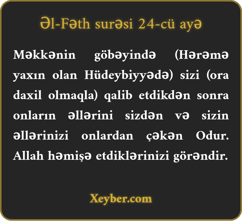 Məkkənin göbəyində (Hərəmə yaxın olan Hüdeybiyyədə) sizi (ora daxil olmaqla) qalib etdikdən sonra onların əllərini sizdən və sizin əllərinizi onlardan çəkən Odur. Allah həmişə etdiklərinizi görəndir.