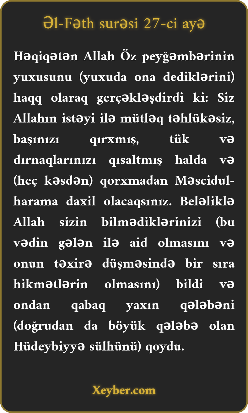 Həqiqətən Allah Öz peyğəmbərinin yuxusunu (yuxuda ona dediklərini) haqq olaraq gerçəkləşdirdi ki: Siz Allahın istəyi ilə mütləq təhlükəsiz, başınızı qırxmış, tük və dırnaqlarınızı qısaltmış halda və (heç kəsdən) qorxmadan Məscidul-harama daxil olacaqsınız. Beləliklə Allah sizin bilmədiklərinizi (bu vədin gələn ilə aid olmasını və onun təxirə düşməsində bir sıra hikmətlərin olmasını) bildi və ondan qabaq yaxın qələbəni (doğrudan da böyük qələbə olan Hüdeybiyyə sülhünü) qoydu.