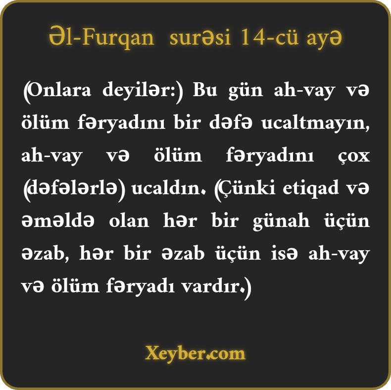 (Onlara deyilər:) Bu gün ah-vay və ölüm fəryadını bir dəfə ucaltmayın, ah-vay və ölüm fəryadını çox (dəfələrlə) ucaldın. (Çünki etiqad və əməldə olan hər bir günah üçün əzab, hər bir əzab üçün isə ah-vay və ölüm fəryadı vardır.)