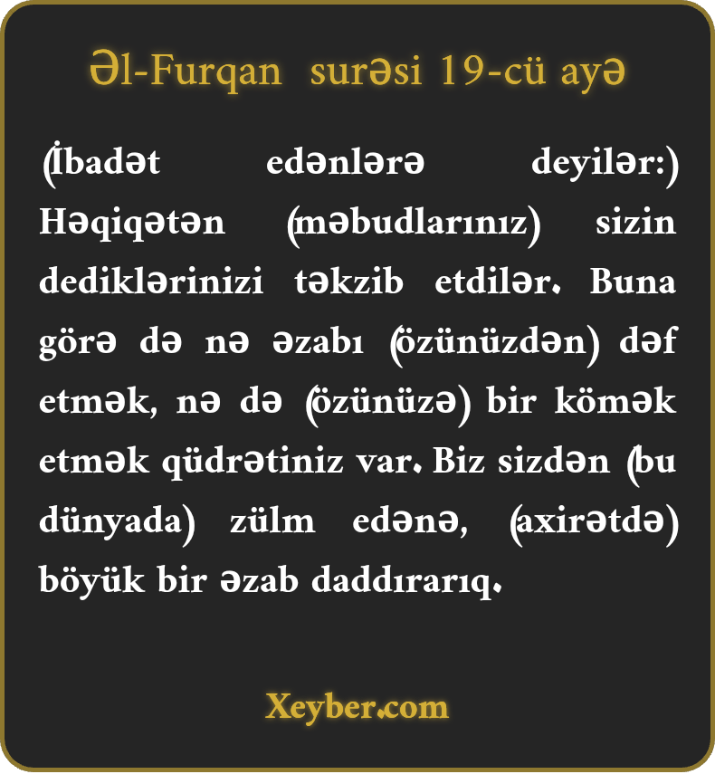 (İbadət edənlərə deyilər:) Həqiqətən (məbudlarınız) sizin dediklərinizi təkzib etdilər. Buna görə də nə əzabı (özünüzdən) dəf etmək, nə də (özünüzə) bir kömək etmək qüdrətiniz var. Biz sizdən (bu dünyada) zülm edənə, (axirətdə) böyük bir əzab daddırarıq.