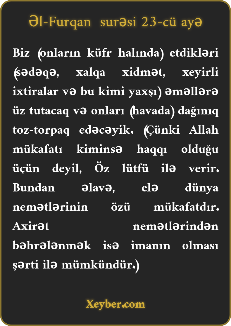Biz (onların küfr halında) etdikləri (sədəqə, xalqa xidmət, xeyirli ixtiralar və bu kimi yaxşı) əməllərə üz tutacaq və onları (havada) dağınıq toz-torpaq edəcəyik. (Çünki Allah mükafatı kiminsə haqqı olduğu üçün deyil, Öz lütfü ilə verir. Bundan əlavə, elə dünya nemətlərinin özü mükafatdır. Axirət nemətlərindən bəhrələnmək isə imanın olması şərti ilə mümkündür.)