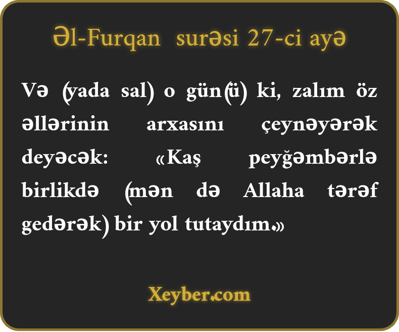 Və (yada sal) o gün(ü) ki, zalım öz əllərinin arxasını çeynəyərək deyəcək: «Kaş peyğəmbərlə birlikdə (mən də Allaha tərəf gedərək) bir yol tutaydım.»