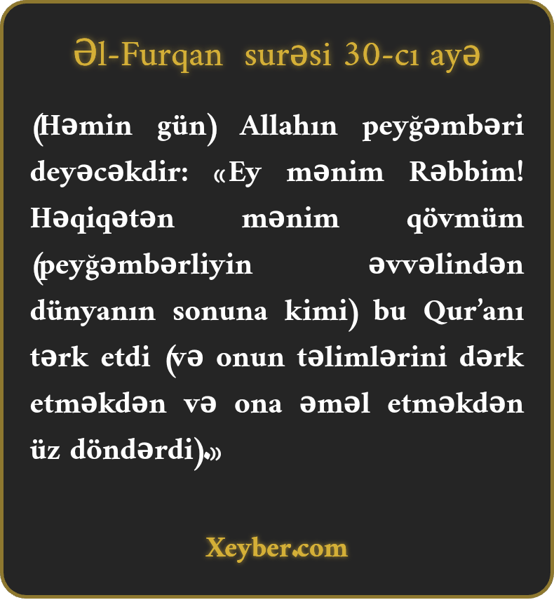 (Həmin gün) Allahın peyğəmbəri deyəcəkdir: «Ey mənim Rəbbim! Həqiqətən mənim qövmüm (peyğəmbərliyin əvvəlindən dünyanın sonuna kimi) bu Qur’anı tərk etdi (və onun təlimlərini dərk etməkdən və ona əməl etməkdən üz döndərdi).»