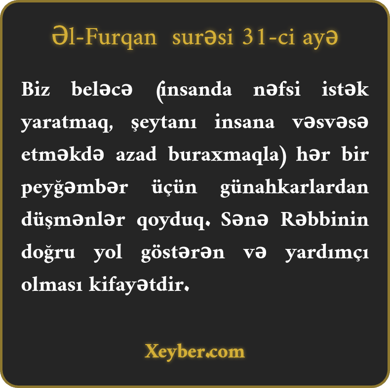 Biz beləcə (insanda nəfsi istək yaratmaq, şeytanı insana vəsvəsə etməkdə azad buraxmaqla) hər bir peyğəmbər üçün günahkarlardan düşmənlər qoyduq. Sənə Rəbbinin doğru yol göstərən və yardımçı olması kifayətdir.