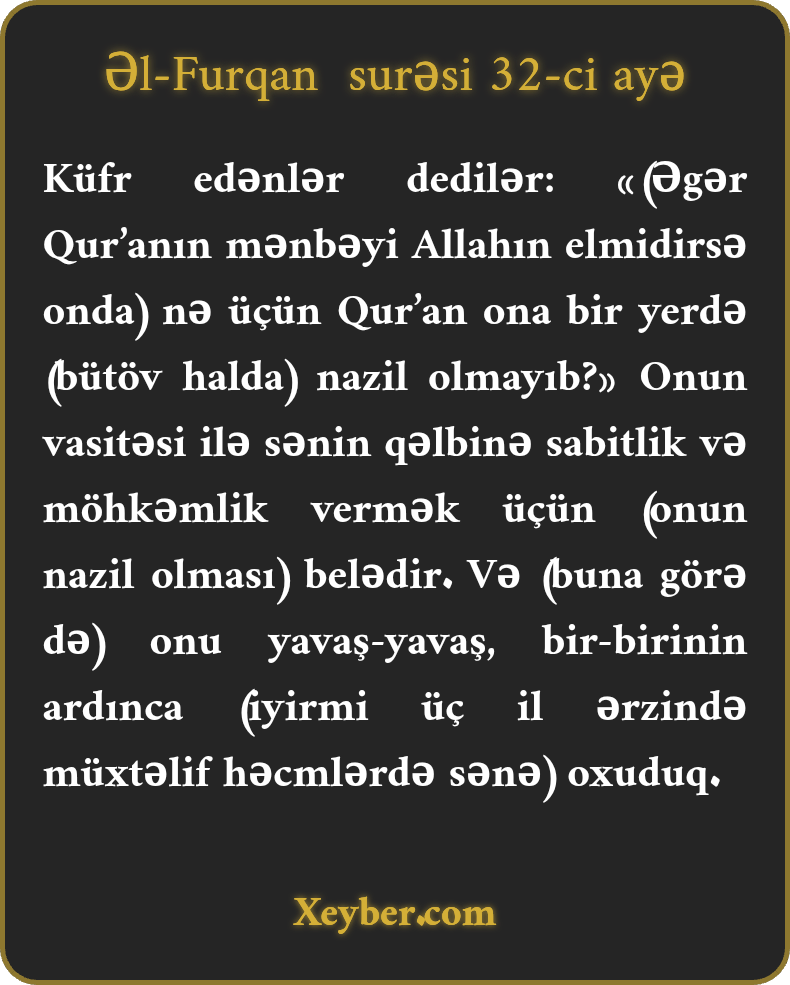 Küfr edənlər dedilər: «(Əgər Qur’anın mənbəyi Allahın elmidirsə onda) nə üçün Qur’an ona bir yerdə (bütöv halda) nazil olmayıb?» Onun vasitəsi ilə sənin qəlbinə sabitlik və möhkəmlik vermək üçün (onun nazil olması) belədir. Və (buna görə də) onu yavaş-yavaş, bir-birinin ardınca (iyirmi üç il ərzində müxtəlif həcmlərdə sənə) oxuduq.