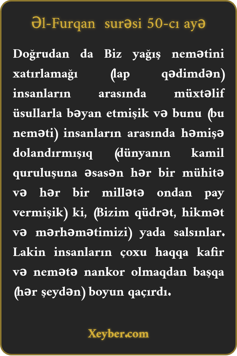 Doğrudan da Biz yağış nemətini xatırlamağı (lap qədimdən) insanların arasında müxtəlif üsullarla bəyan etmişik və bunu (bu neməti) insanların arasında həmişə dolandırmışıq (dünyanın kamil quruluşuna əsasən hər bir mühitə və hər bir millətə ondan pay vermişik) ki, (Bizim qüdrət, hikmət və mərhəmətimizi) yada salsınlar. Lakin insanların çoxu haqqa kafir və nemətə nankor olmaqdan başqa (hər şeydən) boyun qaçırdı.
