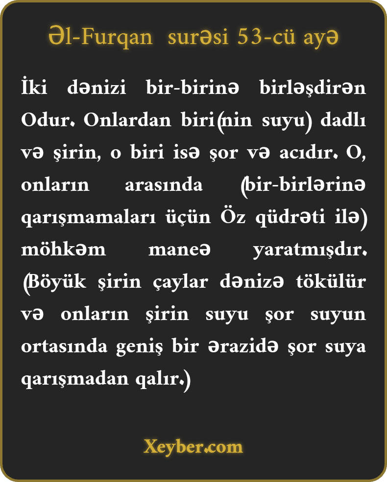 İki dənizi bir-birinə birləşdirən Odur. Onlardan biri(nin suyu) dadlı və şirin, o biri isə şor və acıdır. O, onların arasında (bir-birlərinə qarışmamaları üçün Öz qüdrəti ilə) möhkəm maneə yaratmışdır. (Böyük şirin çaylar dənizə tökülür və onların şirin suyu şor suyun ortasında geniş bir ərazidə şor suya qarışmadan qalır.)
