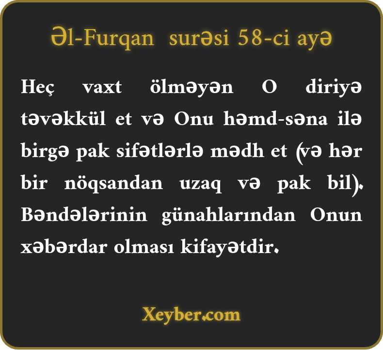 Heç vaxt ölməyən O diriyə təvəkkül et və Onu həmd-səna ilə birgə pak sifətlərlə mədh et (və hər bir nöqsandan uzaq və pak bil). Bəndələrinin günahlarından Onun xəbərdar olması kifayətdir.