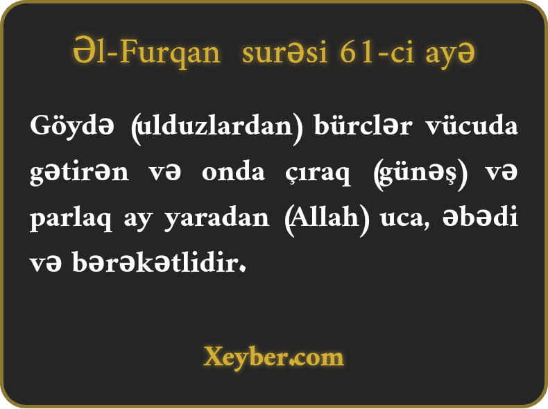 Göydə (ulduzlardan) bürclər vücuda gətirən və onda çıraq (günəş) və parlaq ay yaradan (Allah) uca, əbədi və bərəkətlidir.